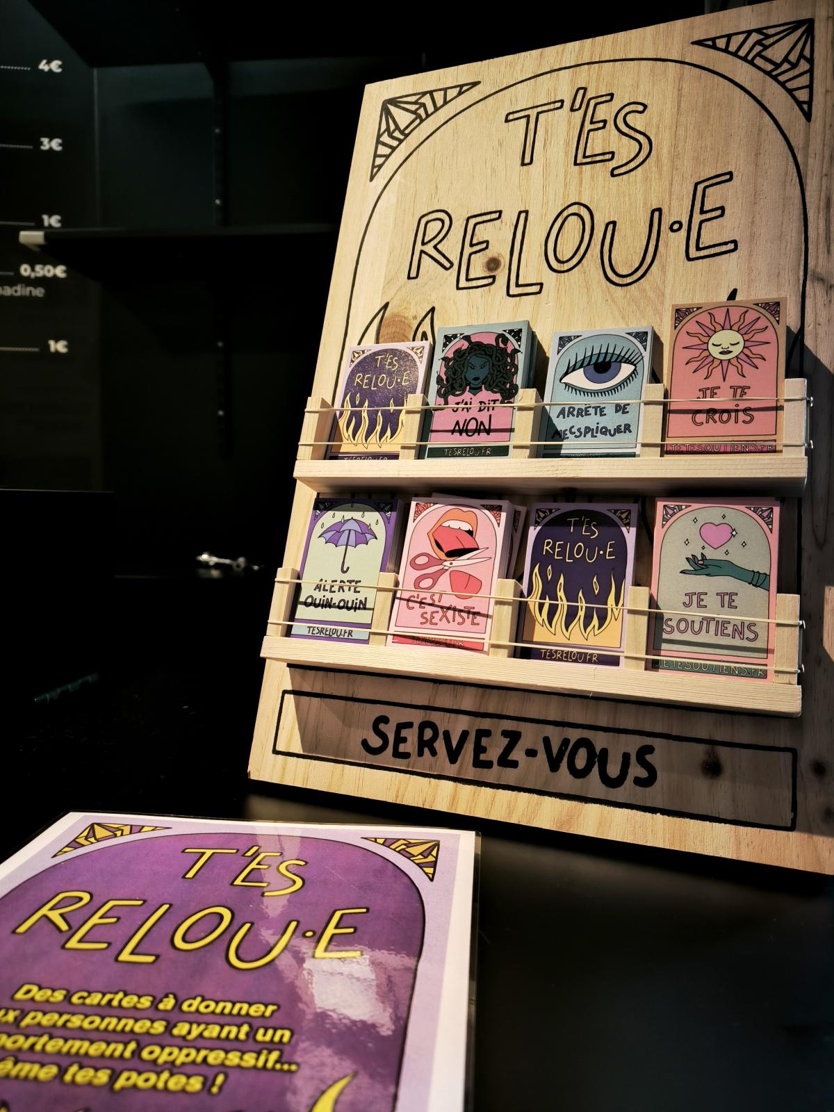 Des présentoirs T'es relou·e et cartes du love dans nos trois lieux